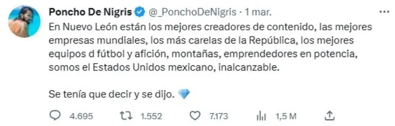 "En Nuevo León están los mejores creadores de contenido, las mejores empresas mundiales, los más carelas de la República, los mejores equipos de futbol y afición, montañas, emprendedores en potencia, somos el Estados Unidos mexicano, inalcanzable", escribió ´Poncho´ de Nigris.